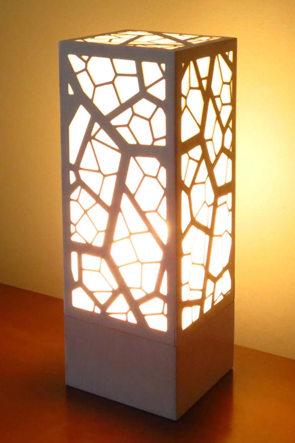 The “Cellular” lamp is crafted from laser cut birch plywood and acrylic. The design is generated parametrically using Grasshopper for Rhino and based on a Voronoi diagram formed from random points. Here, the pattern hosts three levels of cell sizes, and wall thicknesses to invoke an organic network of branching hierarchies.