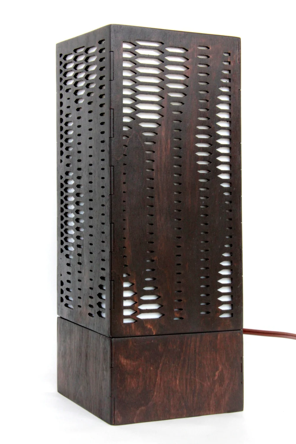 (5.5″x5.5″x14″) Laser cut, chocolate stained, birch plywood; solid white, stained glass; lamp parts – 2013.