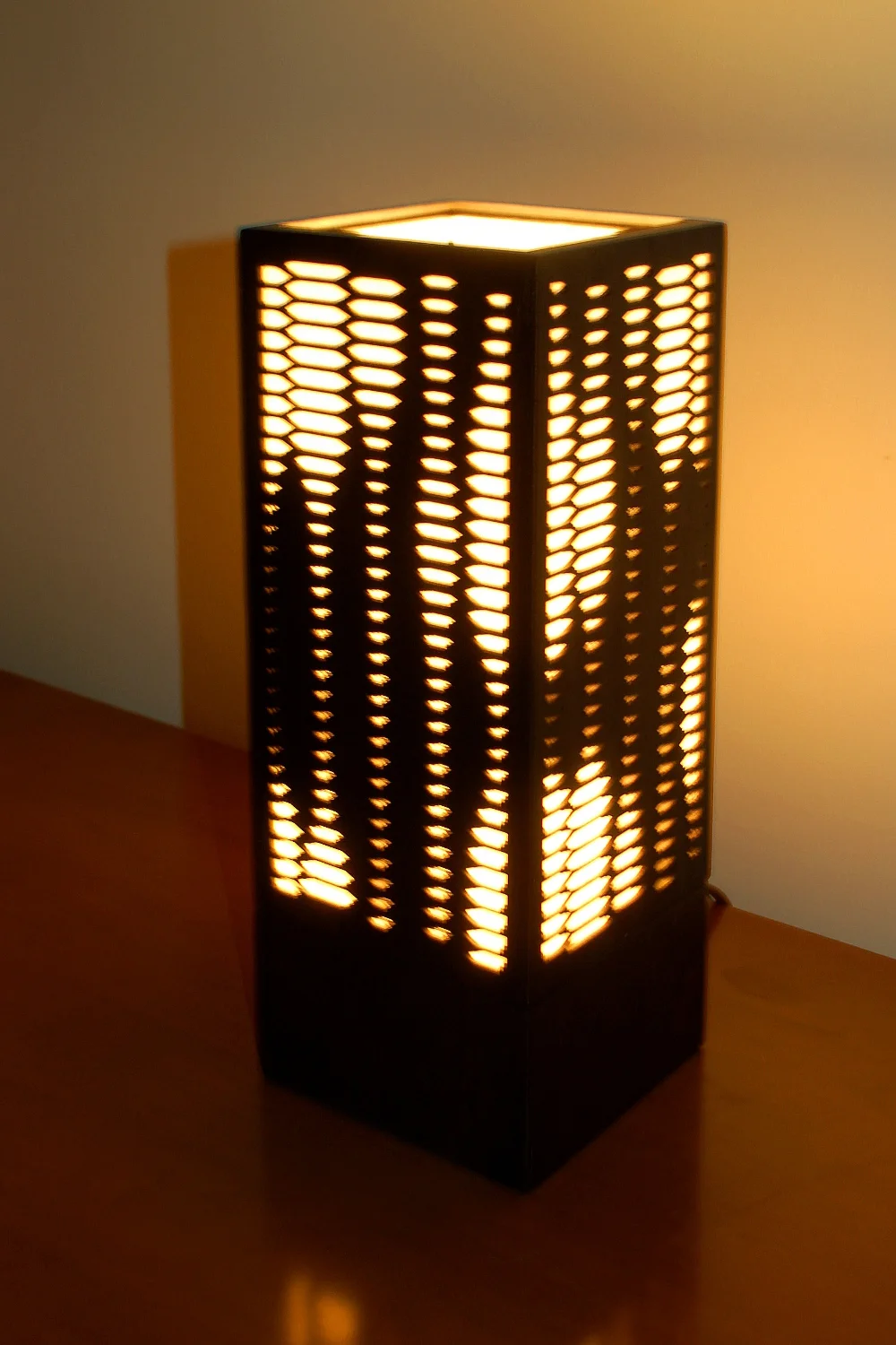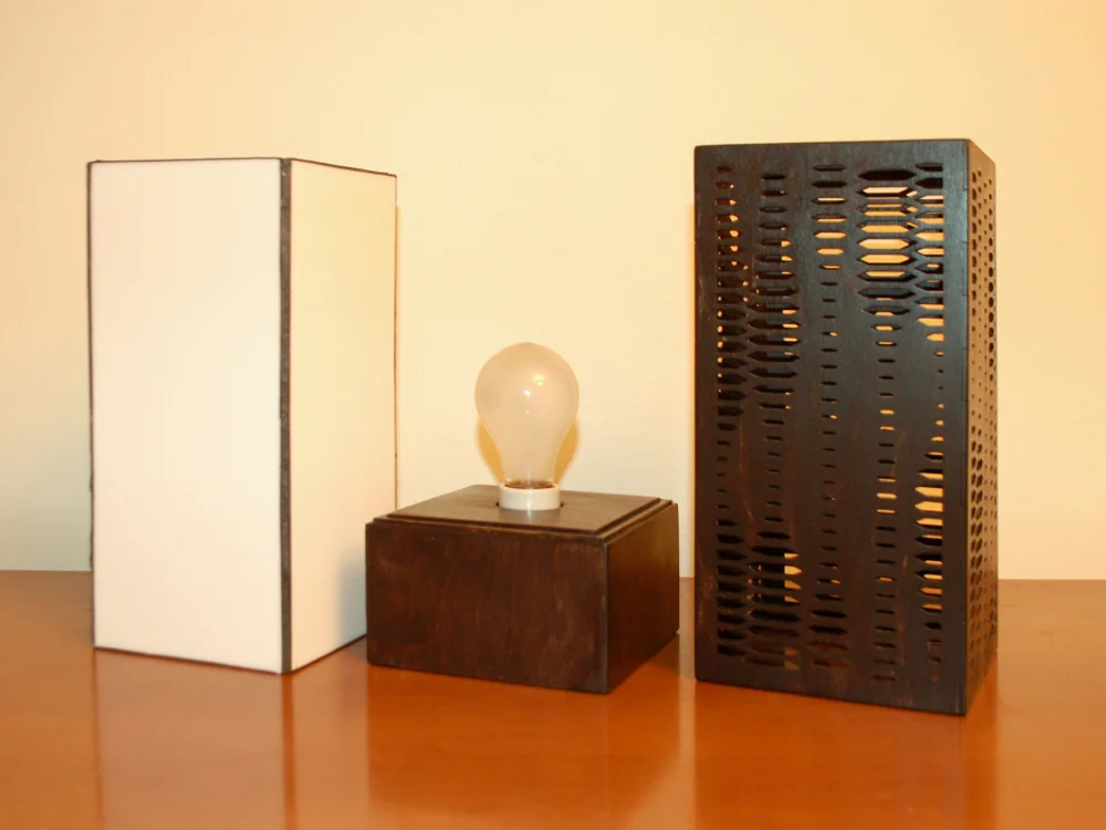 “Pulse” is a laser cut light fixture designed parametrically using Grasshopper for Rhino. The design is based on a modified hexagonal grid using randomly distributed attractor points to alter the scale of the hex shaped holes. This modification creates a wave effect across the surface of the fixture as well as wrapping the sides, and recalls pulsating wave forms as well as sunlight reflecting off of ripples in a pond. This table lamp is fabricated from laser cut 1/8″ thick birch plywood on a Full Spectrum 40W Hobby laser cutter. The wood is cut, hand sanded, stained, and finished. The stained glass “insert” is hand assembled using a copper foiled technique and was fabricated using an opalescent, translucent, solid white glass in this version. As always, both glass color & pattern as well as wood stain color can be modified upon request.